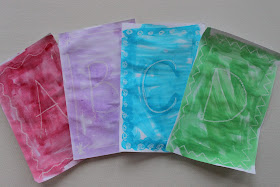 FYI...For letters A and B we used watered down washable Crayola paint. For letters C and D, we used the Do-a-Dot markers. The markers seemed to work better.